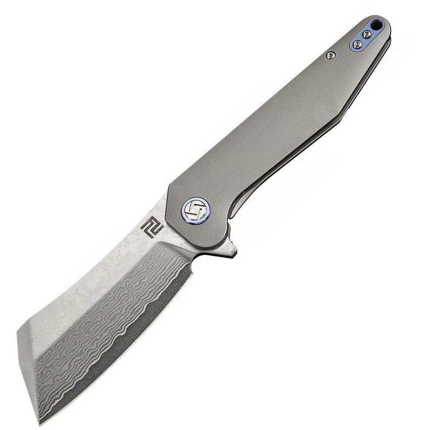 Model – ATZ1803GDGY. Artisan 1803GDGY – Osprey Framelock Knife with Gray Titanium Handle. 5″ closed. 3.75″ Damascus steel blade. Gray titanium handle. Extended tang. Lanyard hole. Pocket clip. Metal tin. Black nylon zippered storage case. Boxed. Made in China.